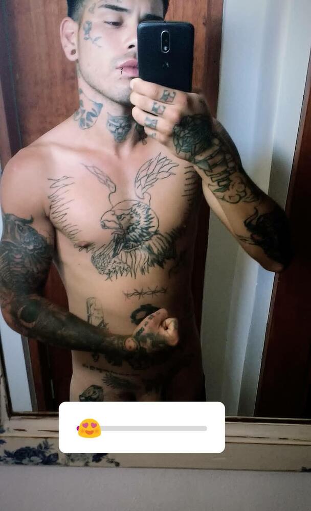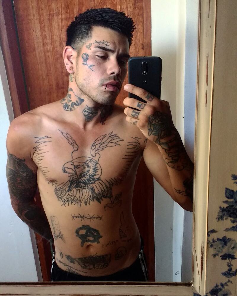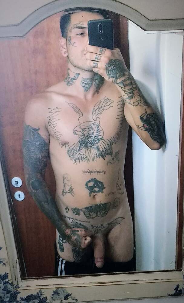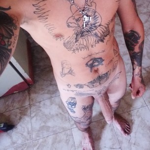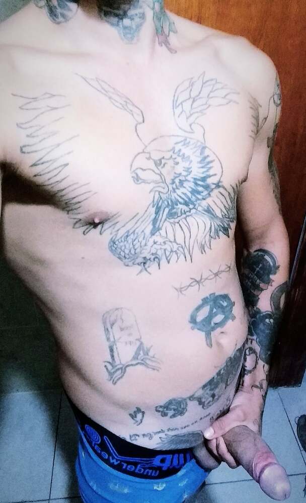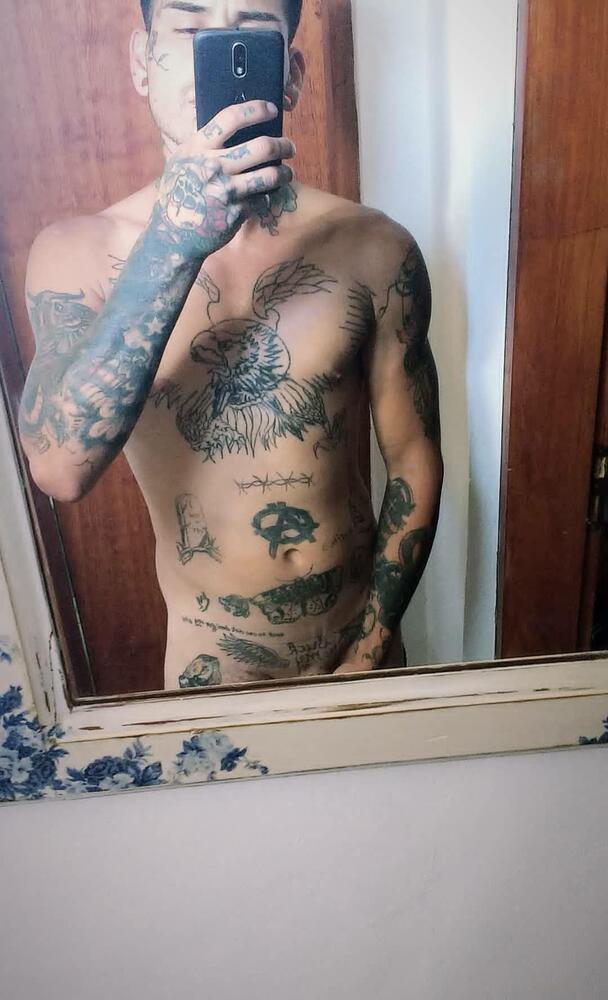 Soy delgado con mi cuerpo cubierto de tatuajes.